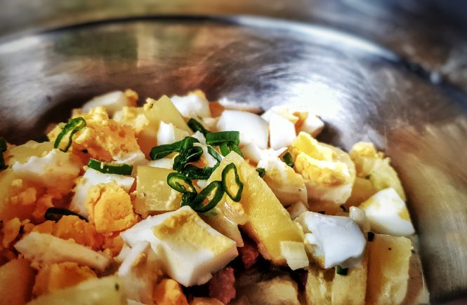 - Die Kartoffeln in reichlich Salzwasser ca. 20 Minuten bissfest kochen. Anschließend pellen und in 1 cm dicke Scheiben schneiden.