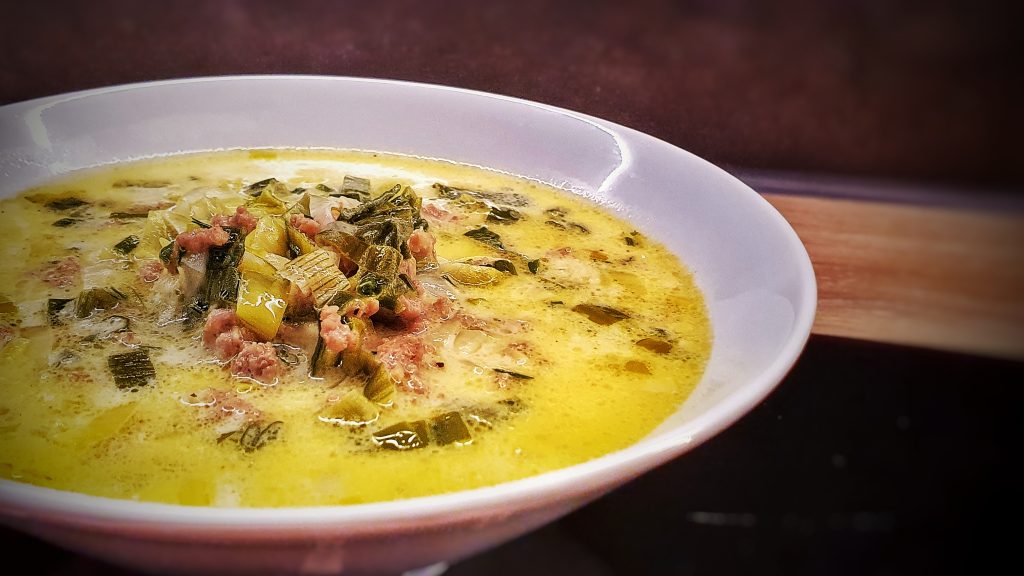 - Die Suppe mit Schnittlauch und Muskat würzen und mit Salz und Pfeffer abschmecken.