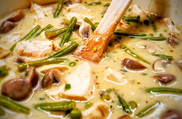 - Das Huhn in mundgerechte Stücke schneiden, zusammen mit den Erbsen in den Topf geben und weitere 5 Minuten gar ziehen lassen.