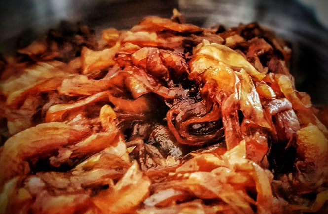 - Salz und Zucker hinzufügen und bei mittlerer Hitze für ca. 10 Minuten karamellisieren lasen.