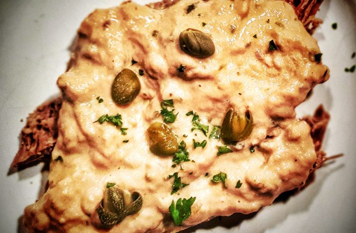 - Für die Sauce das Ei trennen und das Eigelb zusammen mit Thunfisch, Sardellen, Kapern, 2 EL Olivenöl, 2 EL der Brühe und dem Saft der Zitrone in einen Mixer geben und kurz pürieren.