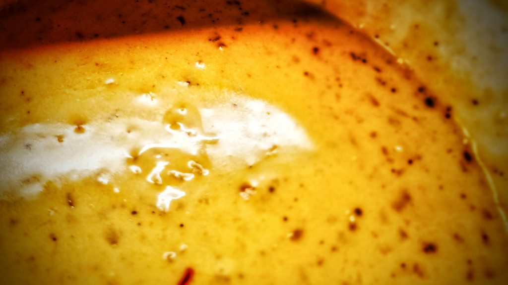 - Den Brühe auf ca 60° C erwärmen und die Safran darin einweichen.