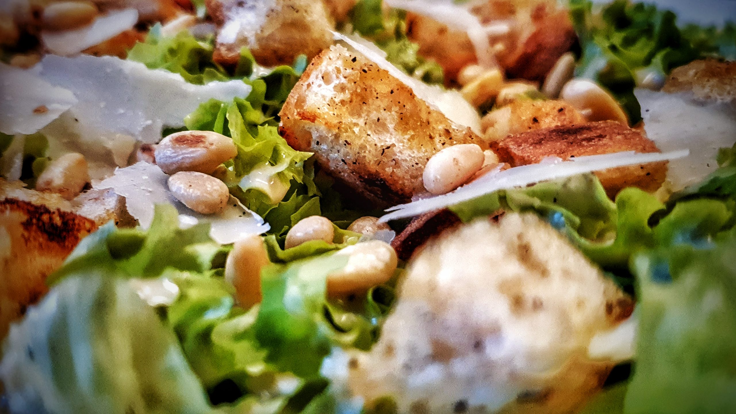 • Den Salat waschen und in mundgerechte Stücke zupfen. Dann mit Caesar’s Dressing vermischen, den Parmesan darüberhobeln und mit Croutons bestreuen.